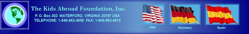 Bruce Cleveland, President The Kids Abroad Foundation P.O. Box 303 Waterford, VA 20197 Phone: 540-882-4008 Fax: 540-882-4810 Email: info@kidsabroad.org
